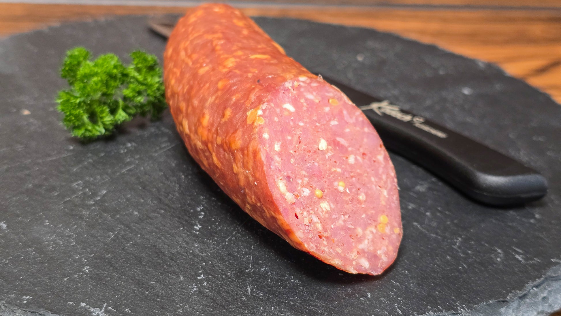 Zutaten: 49% Schweinefleisch, 24% Rindfleisch, Speck, Trinkwasser, jodiertes Speisesalz, Gewürze (SENF), Maltodextrin, Dextrose, Gewürzextrakte, Farbstoff: Karmin, Konservierungsstoff: Natriumnitrit, Antioxidationsmittel: Ascorbinsäure, Natrium-Ascorbat, Stabilisator: Diphosphate